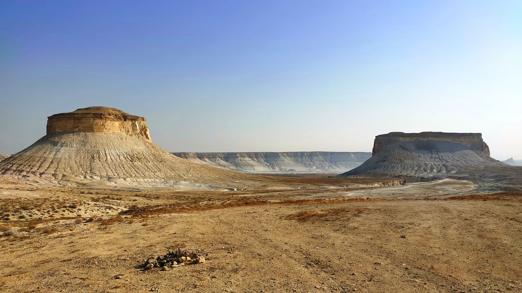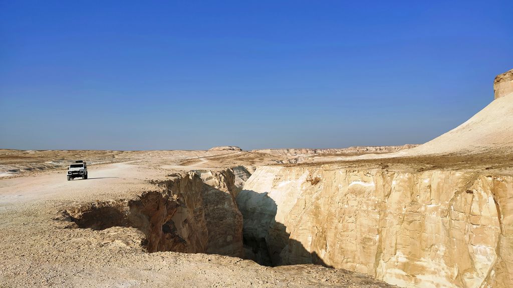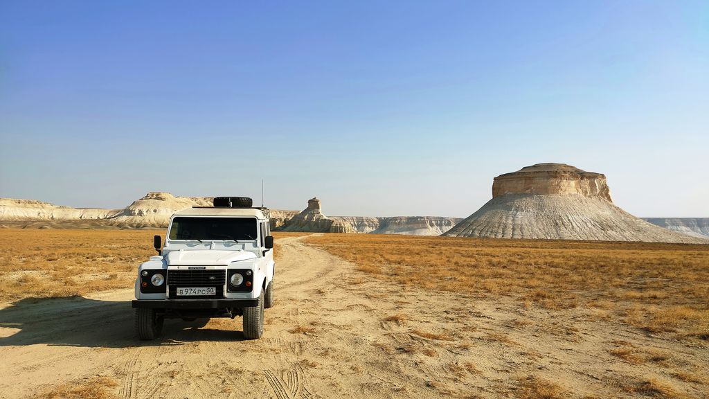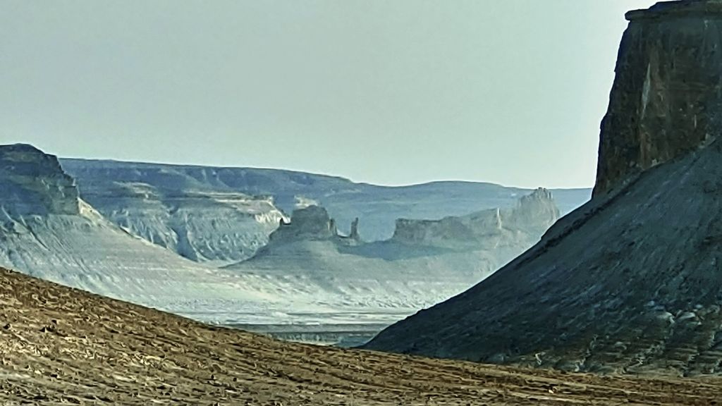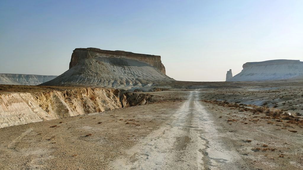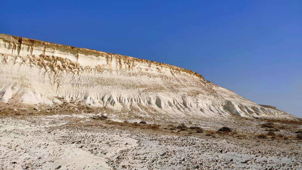 The Bozzhyra tract is a tract on the western edge of the Ustyurt Plateau in Kazakhstan’s Mangystau Region, known for its chalk cliffs and outliers. Translated from Kazakh, Bozzhyra means “Gray Valley.” Located on the Ustyurt Plateau, it was once the bottom of the prehistoric Tethys Ocean and is known for formations like the “Fangs” and “Dragon’s Crest”.